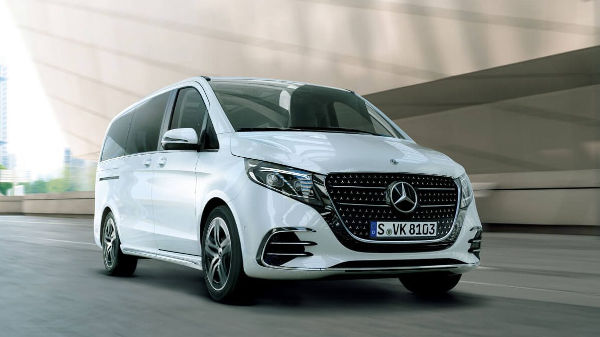 日本で購入できる唯一のバン「Vクラス」。全長も長いですが、全幅も1900超えのためかなり大きく感じます。しかし、サイズが大きいだけに車内の広さは十分です。SUVの7人乗り「GLB」や「GLE」がお気に召さない人にはおすすめです。