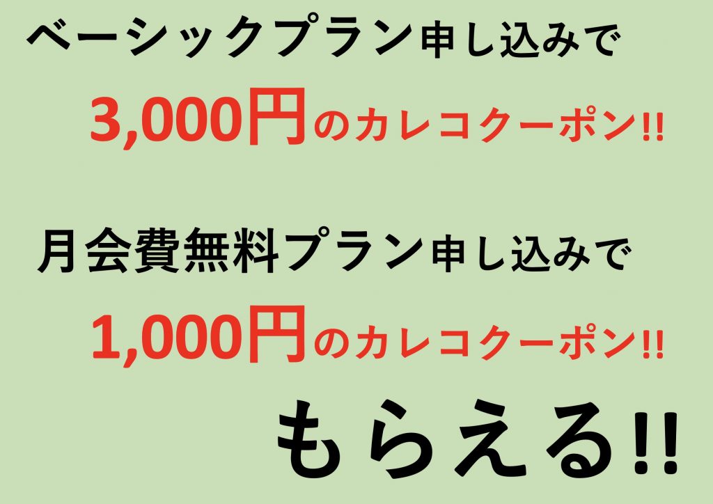 ベーシックプランにお申込みの方:カレコクーポン3,000円分(ご利用開始月を含む2か月間有効)