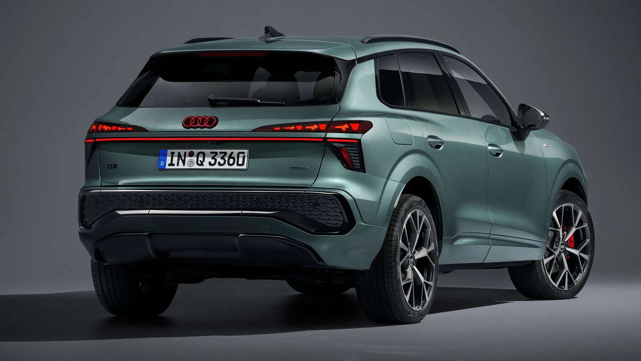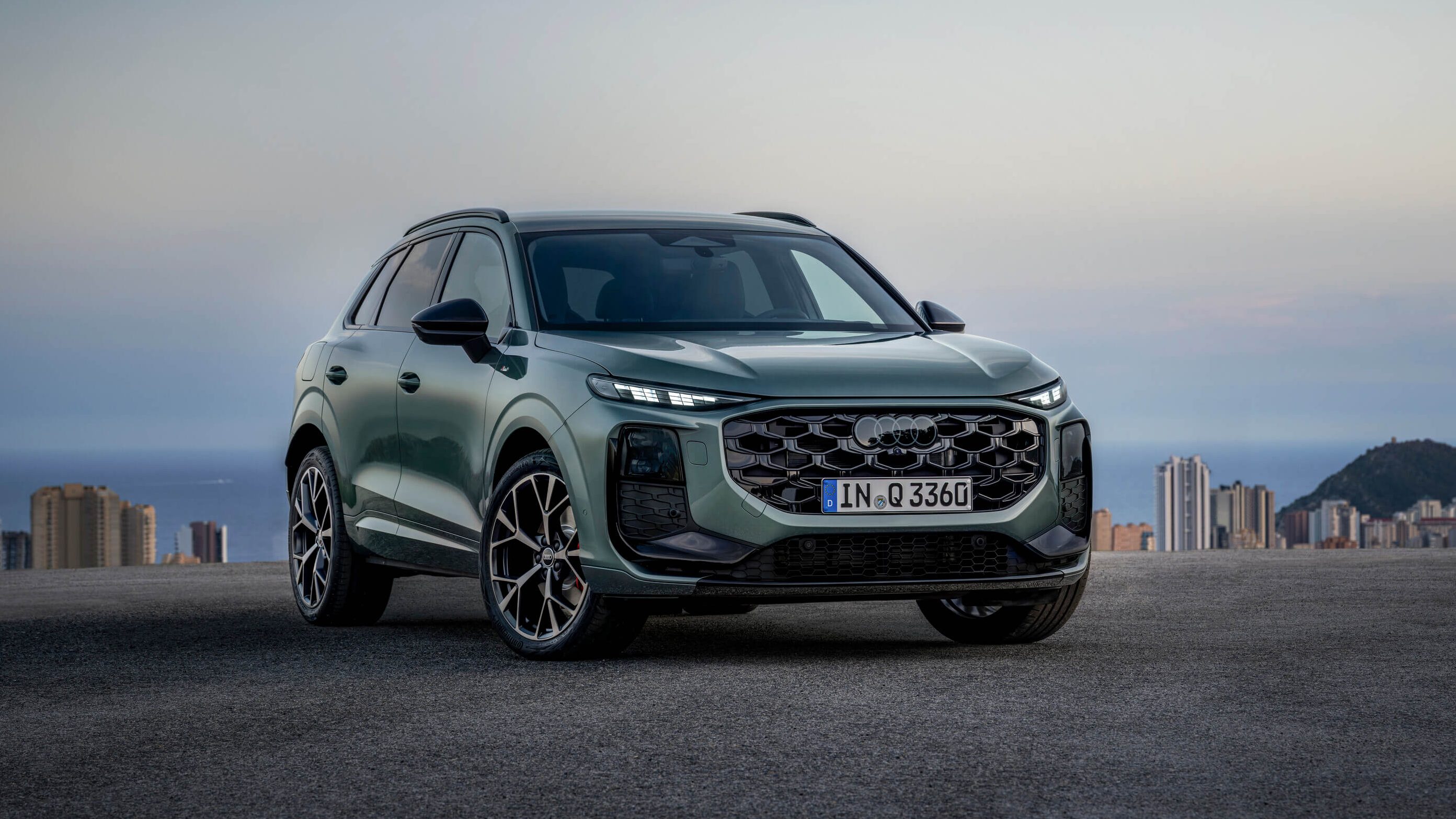 新型Q3は、最新のデザイン言語を採用。ワイドで立体的なシングルフレームグリルとシャープなLEDヘッドライトにより、より精悍なフロントフェイスへと進化しています。ボディラインも直線基調が強まり、SUVらしい力強さと都会的な洗練さを両立しています。
