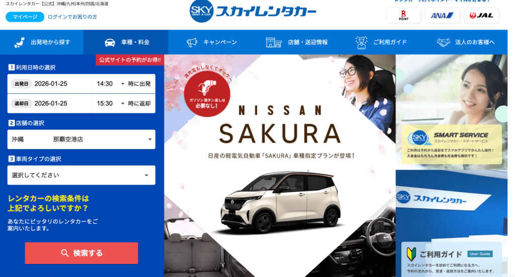 スカイレンタカー公式サイトからの予約なら、JALマイル、ANAマイル、楽天ポイントのいずれかを貯めることができます。