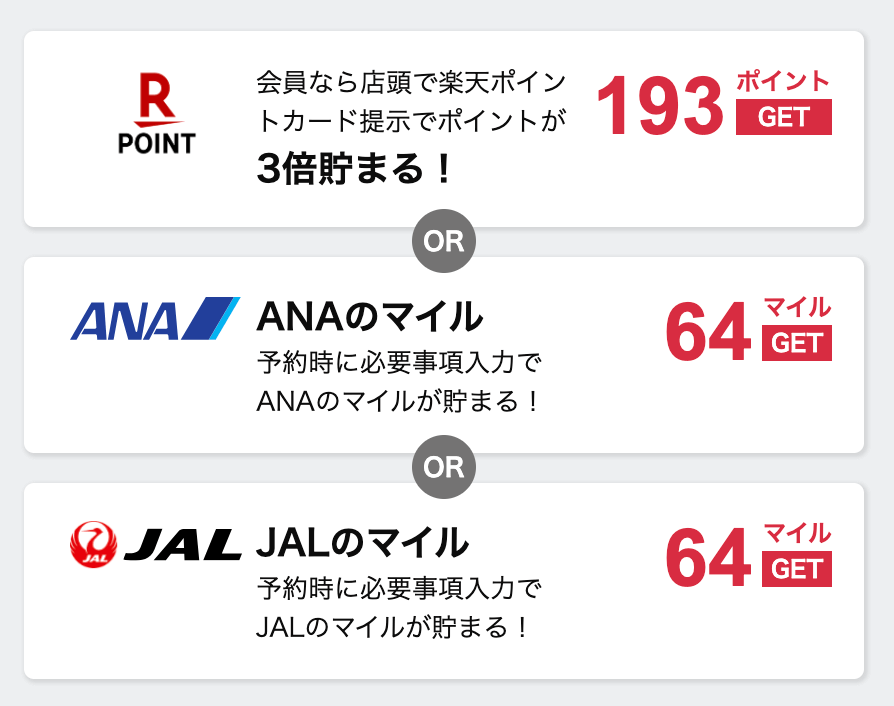 さらに、JALマイル、ANAマイル、楽天ポイント(いずれか1つ)も貯めることができます。